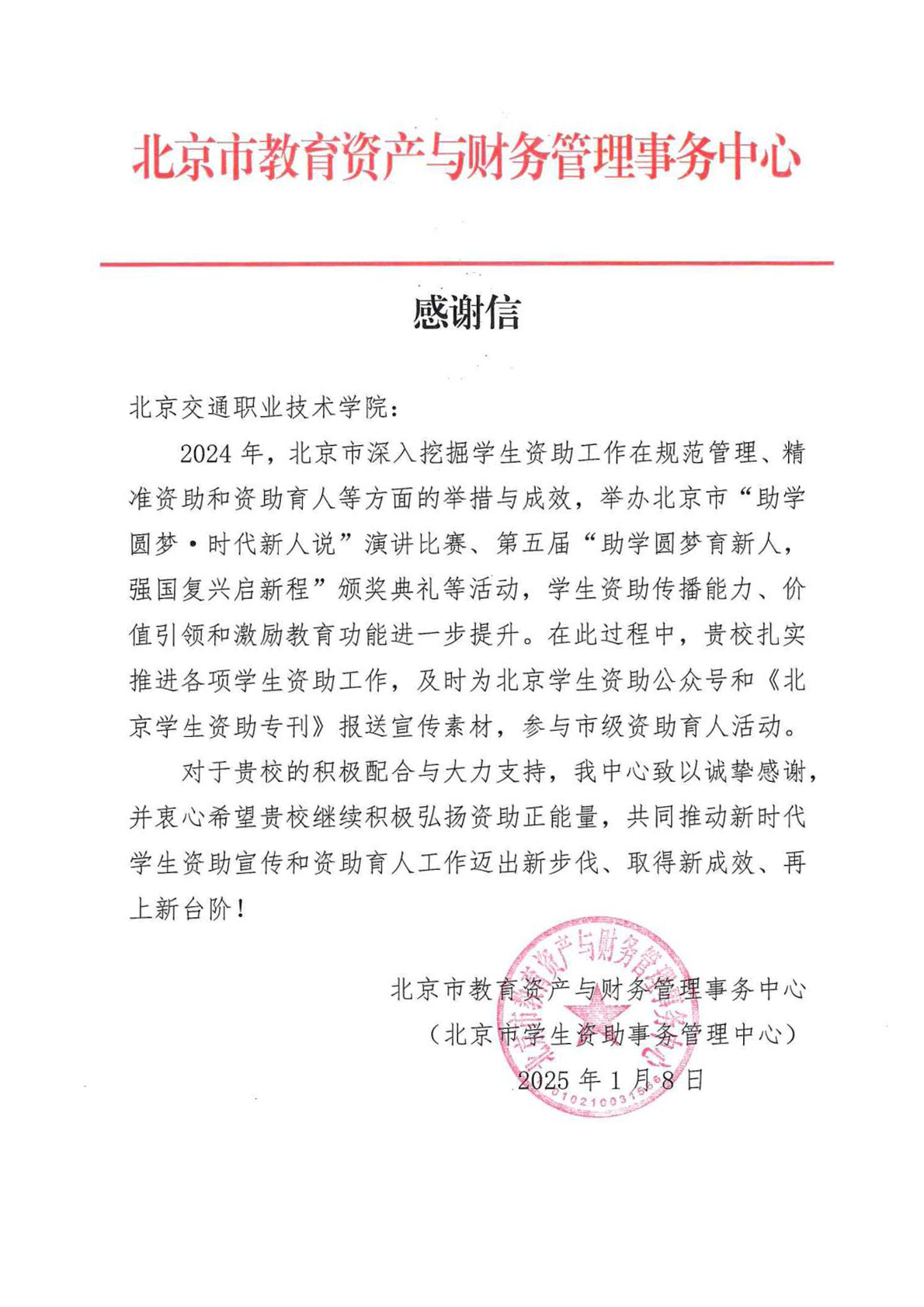 近日,我院收到北京市學生資助事務管理中心發來的感謝信。感謝學院對學生資助工作的高度重視和大力支持,肯定了我院2024年度的學生資助工作,對積極參與北京市資助育人、資助宣傳工作表示感謝。對我院扎實推進各項學生資助工作、積極參與市級資助育人活動作出的貢獻提出表揚。