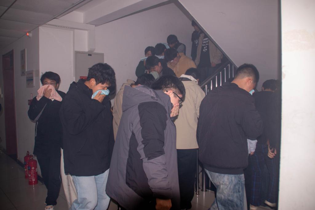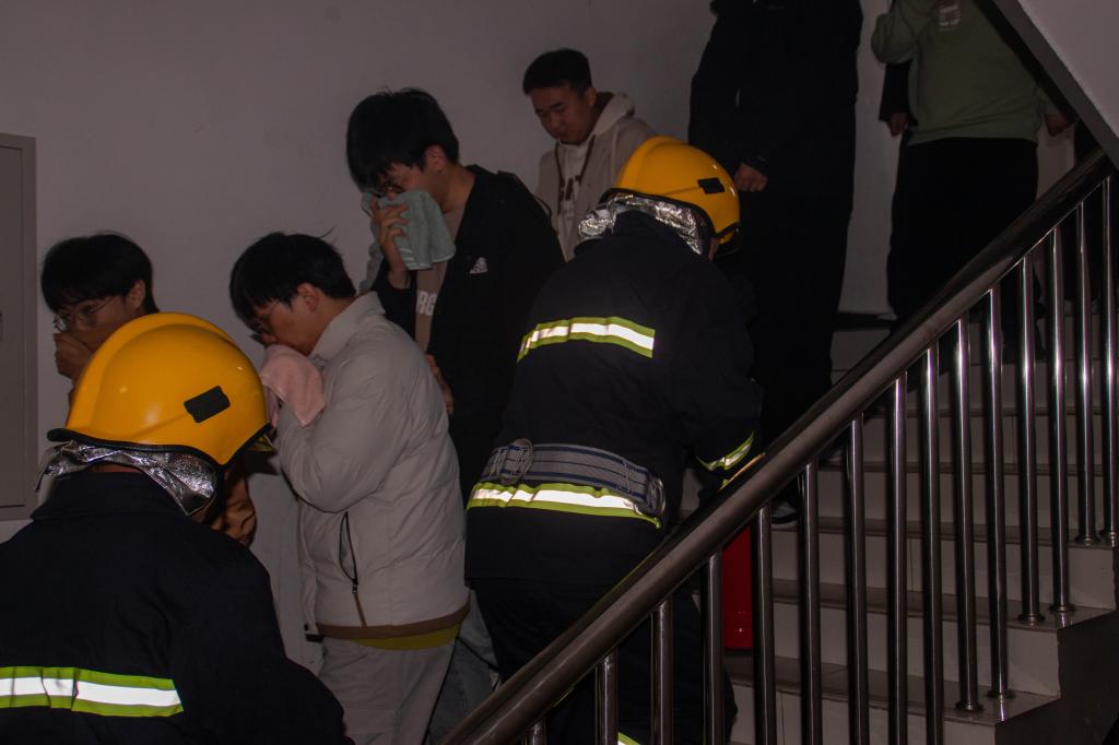 演練模擬學生宿舍樓發生火情。演習當日,隨著王穎副院長一聲令下,消防應急疏散預案立即啟動。宿管員發現火情后迅速上報,中控室同步響應,疏散組組織學生沿安全通道有序撤離,滅火組迅速使用消防器材控制火勢。在模擬濃煙環境中,同學們掩住口鼻、彎腰低姿,快速轉移至室外安全區域。微型消防站隊員同步搜救滯留人員,警戒組維持現場秩序。整個過程反應迅速、配合緊密,在規定時間,所有人員安全疏散,演練順利結束。