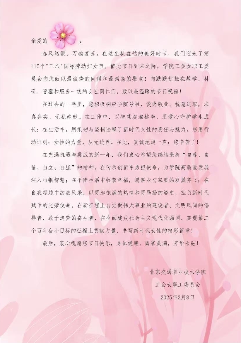 工會女職工委員會向全體女教職工送上了一份特別的“節(jié)日禮”——《致學(xué)院女教職工的一封信》,通過傳遞溫暖與力量,向她們致以崇高的敬意和感謝。希望全體女教職工繼續(xù)秉持“自尊、自信、自立、自強”的精神,在崗位上傳承匠心、追求卓越,在生活中經(jīng)營幸福、彰顯風(fēng)采,以飽滿的熱情和昂揚的姿態(tài),共同書寫屬于新時代女性的精彩篇章。