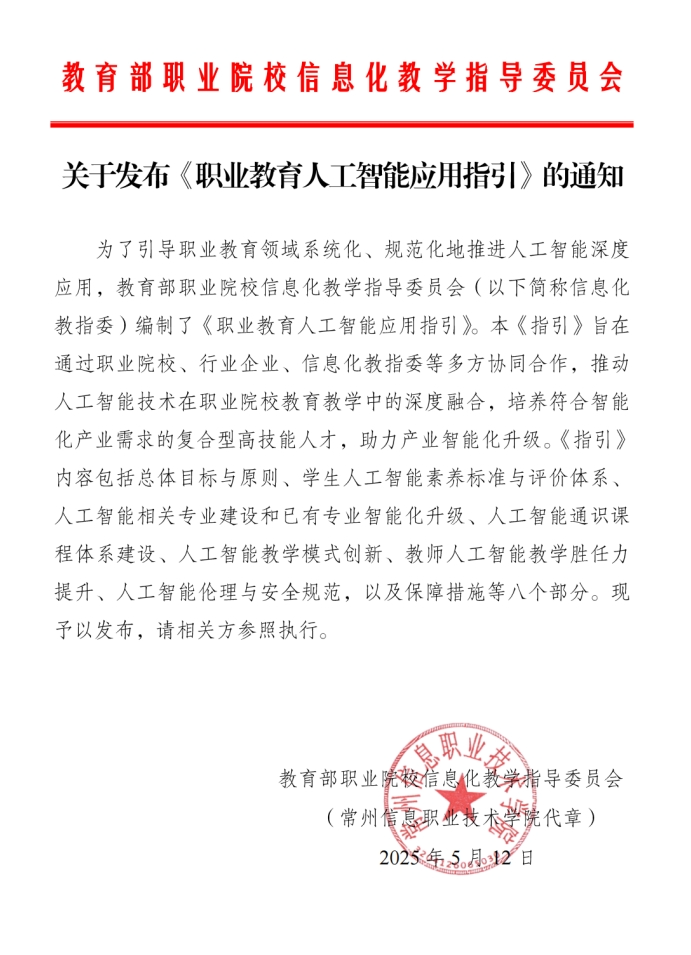 引導職業院校開展適應智能時代的教育教學改革,推進人工智能技術與職業教育教學的深度融合,培養具備人工智能素養及職業能力的技術技能人才,助力產業智能化升級。