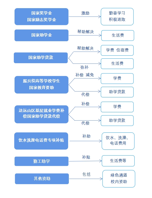 我院學生可以享受到的資助政策有國家獎學金、國家勵志獎學金、國家助學金、服兵役國家教育資助、邊遠山區基層就業學費補償國家助學貸款補償、國家助學貸款(生源地、校園地)、新生“綠色通道”、勤工助學、中央獎補專項資助、飲水洗澡電話費專項補貼等。