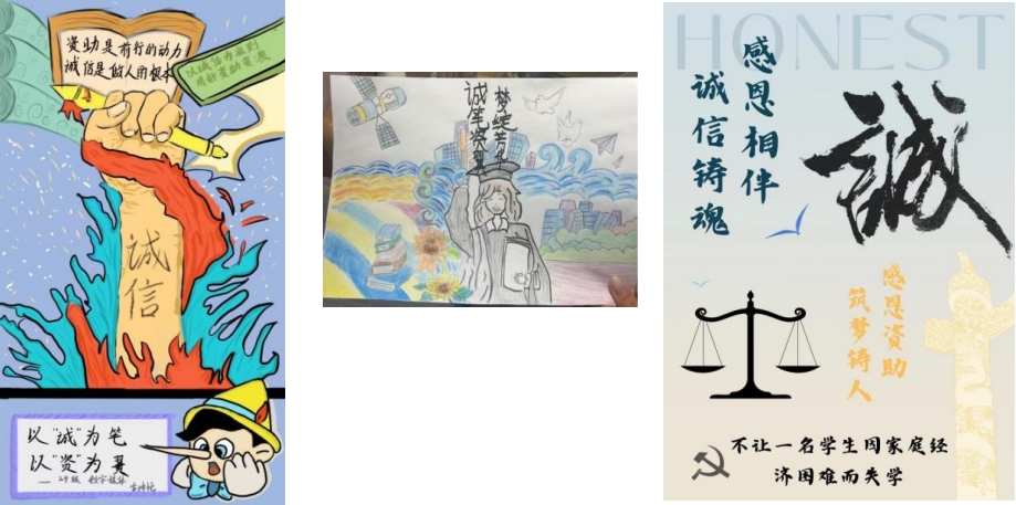 文化節還舉辦了“以‘誠’為筆繪誠信,以‘資’為翼筑夢想”作品征集比賽。通過鼓勵同學們圍繞誠信、勵志、資助主題,以短視頻、手繪海報、電子海報等形式進行創作,為同學們搭建了創意表達平臺,引導學生主動發現、思考并藝術化呈現身邊的誠信、勵志與資助故事,實現自我教育與朋輩引領。