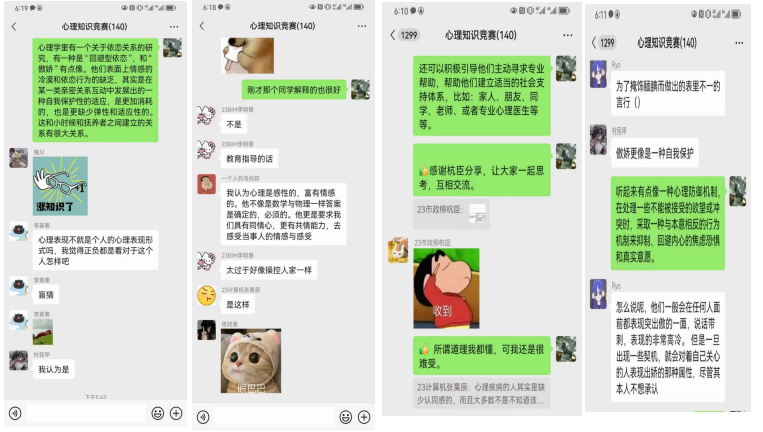 活動開啟后,同學們確立了“以賽促學,學以致用”的目標,并通過心理中心設計的線上題庫進行學習。同學們竭盡全力學習、溫習心理健康知識,認真備賽。在備賽期間,同學們的學習熱情非常高漲,經常將每天學習的心理知識發到群中進行討論,心理中心的老師對同學們提出的問題逐一解答。