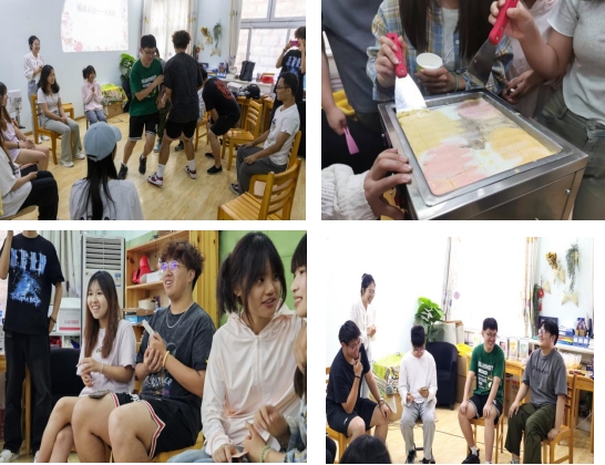 破冰游戲后,張老師帶領(lǐng)同學(xué)們進(jìn)行了冥想體驗(yàn),邀請(qǐng)同學(xué)們選擇不同口味不同顏色的酸奶粉代表自己期盼的感情狀況或目前的感情狀,使用牛奶進(jìn)行調(diào)配,調(diào)配好后使用炒酸奶機(jī)進(jìn)行顏色畫面創(chuàng)造、塑形制作。小組分享制作過程中的感受,作品含義,描述自己期待的愛情,以及自己在愛情中的困惑、愛情價(jià)值觀等。張老師還向同學(xué)們介紹了美國(guó)心理學(xué)家斯騰伯格提出的愛情三元理論,以及三種元素的不同組合形式構(gòu)成的七種愛情形式。隨后,張老師向團(tuán)體成員分發(fā)了一組戀愛卡牌,卡牌上是對(duì)戀人的形容。每位同學(xué)從中隨機(jī)抽取四張,假設(shè)你的戀人具備著卡牌上的特性,請(qǐng)同學(xué)之間相互點(diǎn)評(píng)每種戀人的優(yōu)劣,在“隨機(jī)分配戀人”的過程中,同學(xué)們總能發(fā)現(xiàn)自己不太滿意的特性,感悟著戀愛不可隨意,需謹(jǐn)慎對(duì)待的道理。緊接著,張老師改變規(guī)則,讓團(tuán)體成員從剩下的牌堆中選取,決定是否用它替代手中的卡牌,并且說明替換的原因,直到最終選出心中最理想的戀人。在這一過程中,每位同學(xué)進(jìn)行了戀愛觀念的交流,心中的理想戀人也逐漸清晰和完善,在往后的時(shí)光中必將減少迷茫,找到正確的人。隨后,張老師邀請(qǐng)同學(xué)們抽取一張?zhí)剿骺?,回答上面的問題,輪流分享自己的問題及答案?;顒?dòng)中,團(tuán)體成員們品嘗了自己親手制作的炒酸奶,活動(dòng)在愉快的氛圍中結(jié)束。