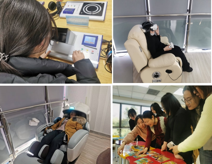 本次活動(dòng)在北京市青年宮老師們的帶領(lǐng)下有序進(jìn)行。在科普展中,通過體驗(yàn)情緒識(shí)別與微笑訓(xùn)練系統(tǒng)、心理自助服務(wù)系統(tǒng)、互動(dòng)宣泄系統(tǒng)、行為認(rèn)知系統(tǒng)、“錯(cuò)覺圖”等,大家對(duì)自身的健康狀況、心理狀態(tài)和心理能力有了更加專業(yè)的了解。在心理設(shè)備體驗(yàn)室環(huán)節(jié),減壓太空艙、VR放松設(shè)備、心理科普儀器、沉浸式放松體驗(yàn)緩解了老師們的疲憊。在心理卡牌“盜夢(mèng)空間”的團(tuán)體活動(dòng)中,老師們從卡片的抽取到團(tuán)隊(duì)之間的彼此交流,策略商定,全力思考描述。每個(gè)人都沉下心去聆聽伙伴們的表達(dá),彼此之間相互感知,理解對(duì)方表達(dá)的內(nèi)容,在一次次的耐心確認(rèn)與溝通后,慢慢的將手中“碎片”一樣的畫面,拼湊成一個(gè)“神奇故事”,也在集體智慧碰撞中發(fā)現(xiàn)了高效協(xié)作的秘訣。