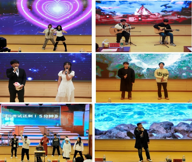 在演出環(huán)節(jié),馮楊靜、李坤艷、王浩楠為同學(xué)們帶來了精彩的舞蹈表演,現(xiàn)場氣氛熱烈;由張璐鵬、鐘梓軒同學(xué)帶來的歌曲《我好像在哪見過你》。孟雨、宋澤雨同學(xué)帶來的歌曲《如果可以》和褚家寶同學(xué)為大家?guī)淼摹稅廴绯彼贰⒚骼佟⒗钚浅峭瑢W(xué)表演的歌曲串燒《演員》+《一生所愛》,讓同學(xué)們感受到愛情的深沉和甜蜜、青春的懵懂和年少的美好;丁羽軒、王昊天、楊帆帆、朱美慧、趙羿、劉俊、丁慧然、董思雨、褚家寶帶來的情景劇《當(dāng)考試還有15分鐘》,用幽默詼諧的方式帶我們感受了期末考試緊張又有趣時光。