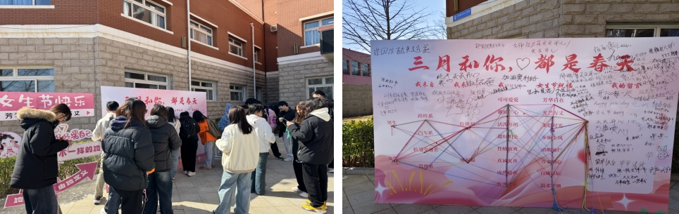 活動伊始,“繞線傳情”祝福展板前便圍滿了熱情的同學。同學們用彩色毛線在祝福板上纏繞讓心儀的文案,連成屬于自己的圖案,手寫留言把情感表達。彩色線圈為同學之間建立別樣的溝通的橋梁,成為情感傳遞的紐帶。一句句“做自己的光”、“愿你永遠自由如風”的暖心寄語傳遞著對女生們的美好期許。不少男生也駐足參與,為身邊的同學、朋友送上真摯祝福,現場洋溢著溫暖與感動。在春日少女留影站,同學們和心態超絕的“石磯”記錄下美好的回憶。罐罐烤奶站,志愿者們精心制作,為同學們送上味道香醇濃郁的養生溫暖奶茶。心理健康協會文藝部的同學們還為女生節獻上了精彩的歌曲表演,贏得陣陣掌聲。