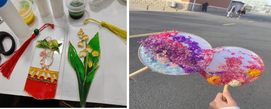 在室內“掐絲琺瑯DIY”體驗區,同學們化身“非遺傳承人”,學習掐絲、點藍等傳統工藝技巧。金絲勾勒出細膩輪廓,彩砂填充出絢麗色彩,一幅幅寓意吉祥的花朵、乘風破浪的圖案逐漸成型。參與者紛紛表示:“沉浸在手作中,不僅感受到非遺技藝的精妙,更體會到專注帶來的內心寧靜。” 干花團扇制作區域同樣人氣高漲。同學們以素面團扇為底,將干花、枝葉精心搭配,創作出獨一無二的古典藝術品。一柄柄團扇或清新淡雅,或華美繁復,執扇輕搖間盡顯東方美學韻味。心理中心老師介紹:“手工創作不僅能激發創造力,更是舒緩壓力、療愈心靈的過程,希望同學們在感受美的同時,學會悅納自我、熱愛生活。”