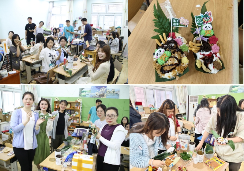 活動正式開始,心理中心的張老師化身“文化使者”,帶領大家追溯端午來源及深厚的傳統文化的內涵與獨特魅力。緊接著,最令人期待的創意 DIY 環節閃亮登場!心理中心準備的物料堪稱“豪華套餐”軟糯的紫米、綿密的動物奶油、造型可愛的櫻花餅干與小熊餅干、酥脆的黃油脆片、香甜的奧利奧,還有色彩繽紛的果醬與巧克力醬、綿密的芋泥、萌趣十足的熊貓粽子軟糖,同時配有端午小插旗、三色繡球話、清香木、羊齒葉加以點綴。在如此豐富的物料及裝飾加持下加持下,師生們靈感如泉涌,一個個造型精美、口味獨特的創意粽子新鮮出爐,不僅顏值超高,更是美味十足。而 “咸甜永動機” 吃法更是引爆全場,咸味蝦片與甜粽的奇妙組合,碰撞出別樣風味,更有“美食冒險家”使用辣條,創造出咸甜辣交織的全新口味,引得眾人紛紛圍觀、爭相嘗試。現場驚嘆聲與歡笑聲此起彼伏。