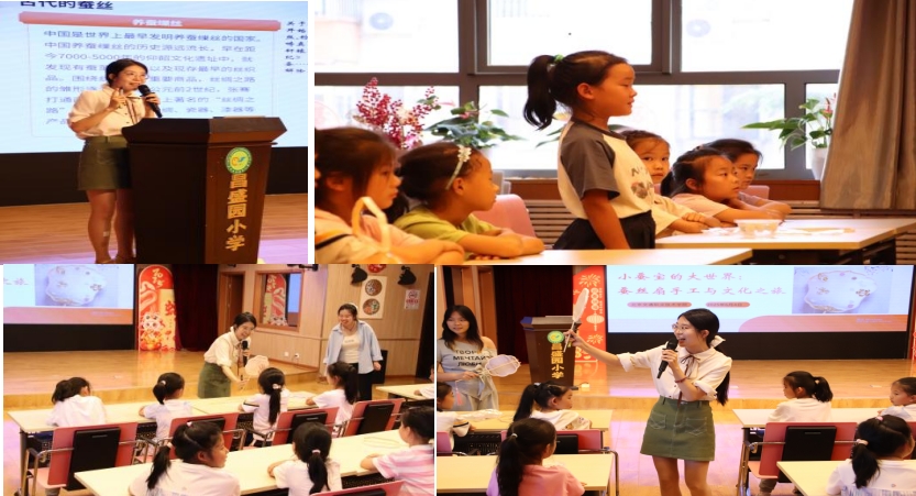 活動伊始,志愿者們手持制作精美的蠶絲扇,向學生們近距離展示了成品。蠶絲扇流光溢彩的扇面瞬間吸引了孩子們的目光,引得他們驚嘆連連,眼神中滿是躍躍欲試的期待。緊接著,張老師開啟了蠶桑文化的科普之旅。從常見的桑葚、桑葉、桑樹、到蠶的成長進程再到我國絲綢之路的形成,張老師用通俗易懂、生動形象的語言,層層遞進地講解相關知識。在講解過程中,學生們全神貫注,目光中滿是好奇與專注,完全沉浸于這獨特的文化魅力之中。面對張老師提出的問題,學生們積極踴躍,紛紛高舉小手搶答,展現出對知識的渴望和積極進取的學習態度。