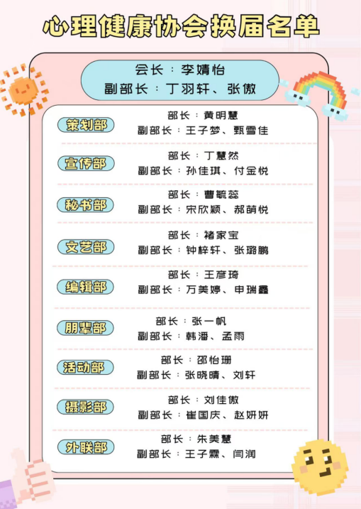 如今,換屆工作已圓滿結束,新一屆干部名單公示如下。展望未來,相信在新團隊的帶領下,心理健康協會必將延續溫暖與力量,為同學們帶來更多精彩的心理活動,續寫屬于我們的美好篇章!