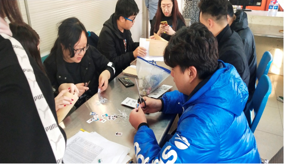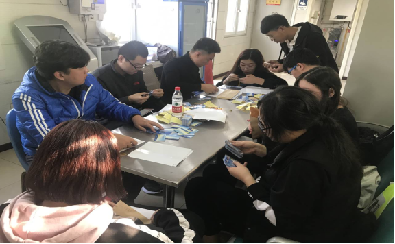到了德勝門公交總站后,大家首先領取了卡片等資料,之后很快進入了工作狀態。為了能更高效的完成這次任務,把全部成員分成兩組,每個組各自安排好工作內容。工作流程總共分為6個環節。其中包括:加蓋印章、填寫學生信息、修剪粘貼照片、貼防偽標簽、貼卡片、貼公交卡保護膜。最后檢查無誤后,按照專業班級將所有公交卡裝入信封。