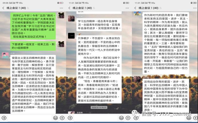 在此次團日活動中,各團支部在線上組織青年集體學習了習近平總書記五四前夕對青年的寄語,學習了習近平總書記給北京大學援鄂醫療隊全體“90后”黨員的回信,重溫了習近平總書記在紀念五四運動100周年大會的講話;有的團支部舉辦了支部專題團課,以團干部講團課的方式組織團員青年開展學習;有的團支部組織召開座談會,講述青年在疫情防控的故事,暢談自己的所做所思所想;圍繞習近平總書記講話精神,結合自身,談了自己的感想和體會。
