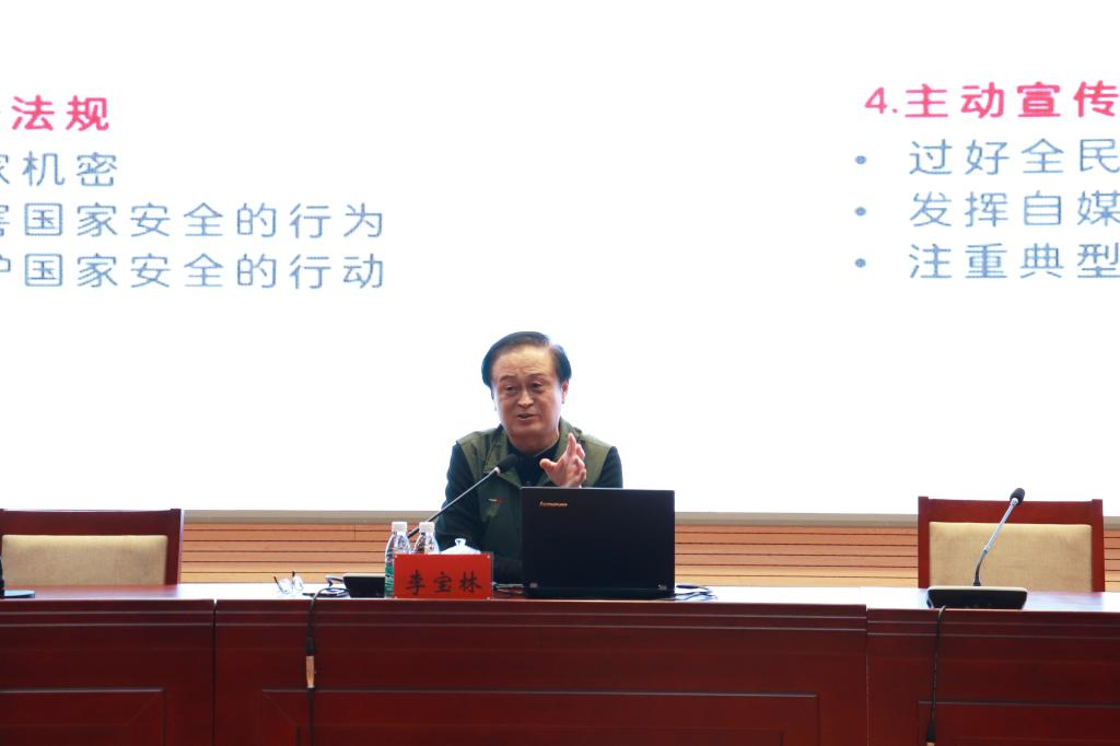 李寶林少將對總體國家安全觀進行了深入的解讀,他強調,“總體國家安全觀涉及二十個重點領域,隨社會發展不斷動態調整,安全觀內涵在不斷延伸。”他號召師生們要加強學習,準確把握總體國家安全觀的內涵;提高站位,領悟總體國家安全觀的精神實質;見微知著,通過強化愛國情懷,遵守國安法規,提升防范能力,主動宣傳引導的方式自覺踐行,為國家安全做出貢獻。