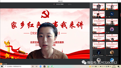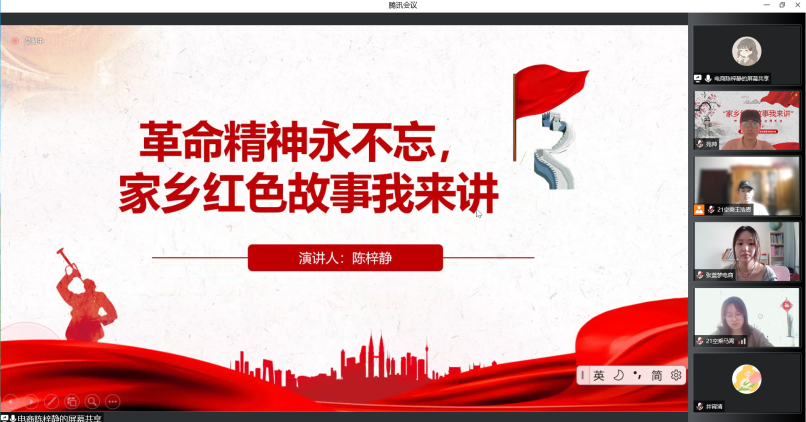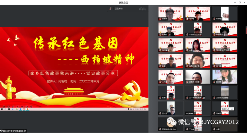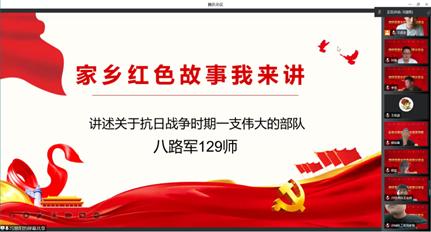 在各班會開展過程中,來自五湖四海的同學們紛紛講述自己家鄉的那段崢嶸歲月,用心感悟黨的奮斗歷程,一個個故事就像一幅幅動人的畫卷展現在同學們面前,雖然此次活動采取線上開展,但是講述人慷慨激昂的宣講還是使同學們仿佛身臨其境。學生們個個聲情并茂、慷慨激昂地講述了一個個既感人至深又催人奮進的家鄉紅色故事。感受到同學們在家鄉紅色故事的耳濡目染下長大。雖未曾與故事的主人公謀面,但大腦里卻時常浮現出革命先輩偉岸的身影。故事中的英雄事跡值得同學們學習,故事中蘊含的革命精神值得我們傳承和發揚,展現了一代代共產黨人前赴后繼,舍生忘死的奮斗精神和堅韌不拔、甘為人梯的奉獻精神;有的講述當地的英雄紀念碑的故事,抒發對革命前輩深深的敬意;有的用感人至深的講述展示了家鄉革命先烈不畏犧牲、堅守初心的堅定意志。充分展現了學生黨史學習教育的所學、所感、所思、所悟。