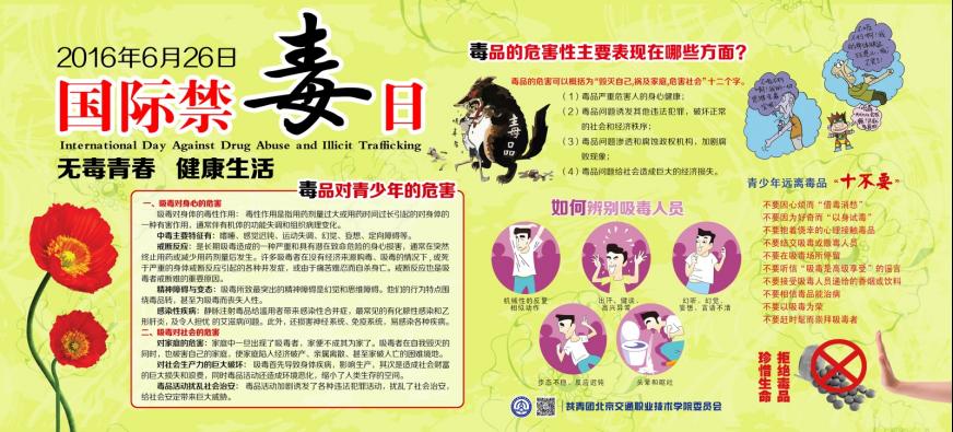 為進(jìn)一步提高學(xué)生對(duì)毒品的防范意識(shí),號(hào)召大家抵制毒品、遠(yuǎn)離毒品,在“6·26”國(guó)際禁毒日來(lái)臨之前,北京交通職業(yè)技術(shù)學(xué)院團(tuán)委開(kāi)展了“無(wú)毒青春,健康生活”為主題的禁毒宣傳教育活動(dòng)。