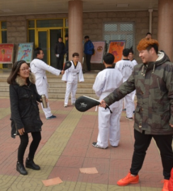 首先,由跆拳道社社員向大家展示學(xué)習(xí)成果,并由社員指導(dǎo)同學(xué)們進(jìn)行踢腳靶,劈板以及有獎(jiǎng)問(wèn)答活動(dòng),讓同學(xué)們體驗(yàn)到其中的內(nèi)涵及文化。在社員展示學(xué)習(xí)成果之前,一起喊出跆拳道精神:禮義廉恥忍耐克己百折不屈;利用踢靶和劈板的環(huán)節(jié),提高愛(ài)好者的思想境界和道德水平,并培養(yǎng)堅(jiān)韌不拔的意志品質(zhì);我們通過(guò)有獎(jiǎng)問(wèn)答的方式,讓同學(xué)們更加深刻的了解跆拳道的基礎(chǔ)知識(shí)。更是讓社員和愛(ài)好者了解到,跆拳道社始終以跆拳道宗旨為行為準(zhǔn)則,不亂用跆拳道,做一個(gè)有武德的跆拳道人為目標(biāo)。