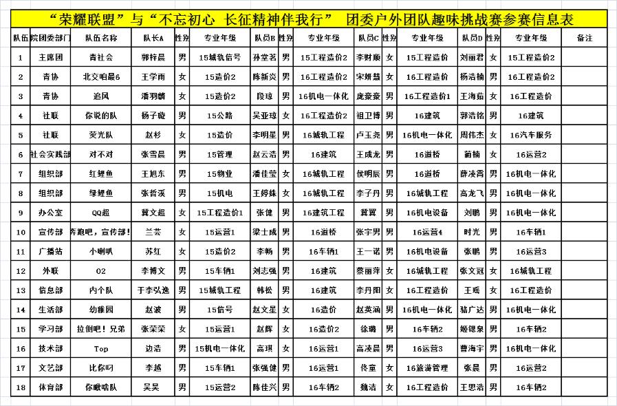 為豐富院團委、社團聯合會、青年志愿者系會、院學生會學生干部機構的活動,增進交流和各機構之間的了解,使我院學生的戶外活動更加多元化,提高我院團委學生干部各項素質,院學生會體育部于2016年11月17日在教一樓221教室舉行北京交通職業技術學院“榮耀聯盟”團委戶外團隊趣味挑戰賽與“不忘初心 長征精神伴我行” 院團委青年戶外挑戰賽啟動儀式,院團委老師顏金海、院團委各部、院學生會、青年志愿者協會、社團聯合會各代表參加了本次會議。本次活動全院共18支隊伍計72名學生參加。