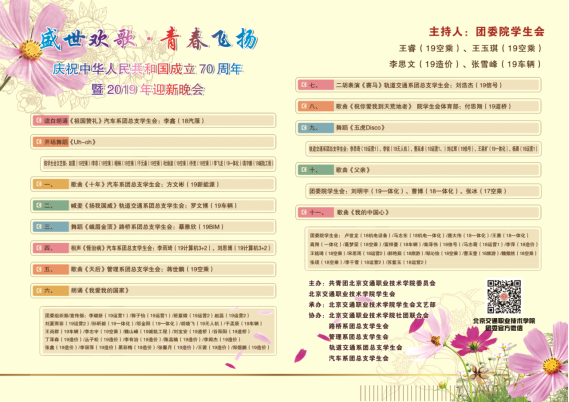 為慶祝中華人民共和國成立70周年,喜迎2019級新同學,激發全院師生愛國、愛黨、愛校的熱情,2019年9月29日晚,我院隆重舉辦 “盛世歡歌·青春飛揚”慶祝中華人民共和國成立70周年暨2019年迎新晚會。學院副院長葛繼祖、黨政辦公室、學生處、團委及各職能部門和系部領導,各班主任老師蒞臨晚會現場,與2019級全體新生共同欣賞了這場視聽盛宴。