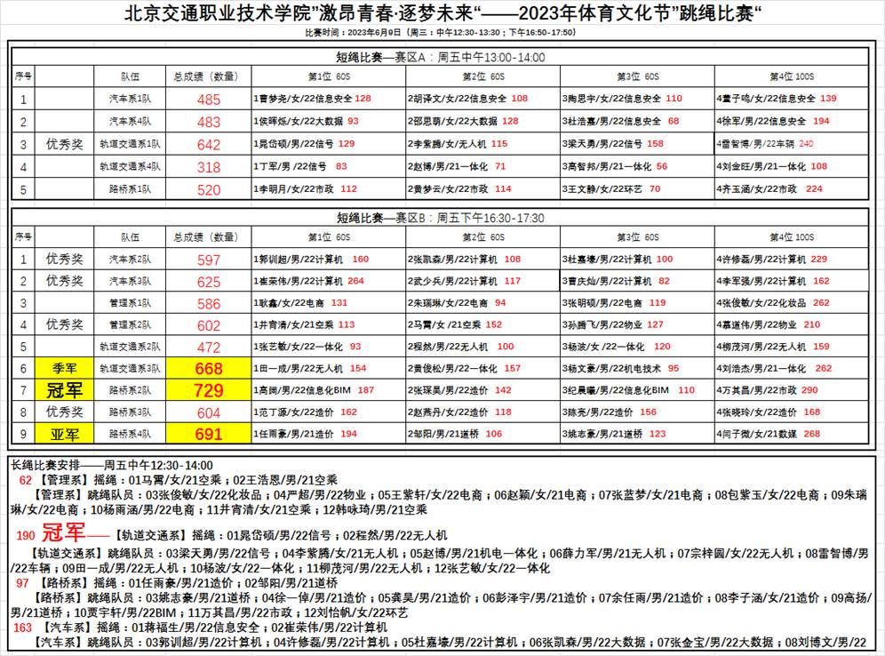 颯爽英姿展風采,同心協力勇爭先。為豐富學生校園文化生活,提高團隊協作能力,使學生牢固樹立健康第一的理念,提高學生身體素質和運動技能水平,加強學院體育文化節品牌活動建設,2023年6月9日,由學院團委主辦,院學生會信息部承辦的“激昂青春?逐夢未來”體育文化節——團體跳繩比賽在學院籃球場南側活動區圓滿舉行。
