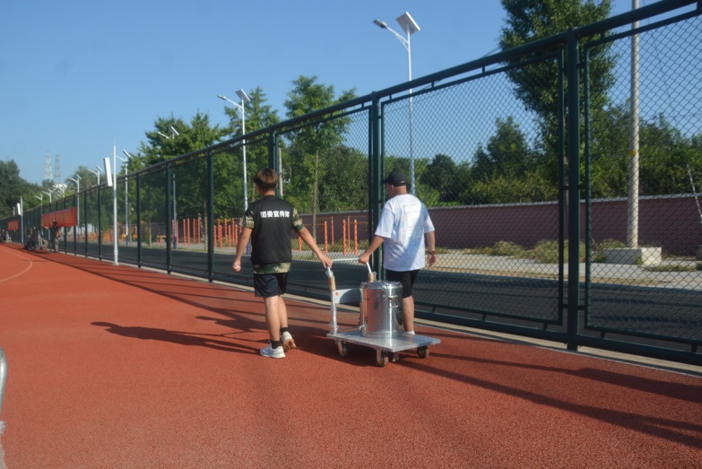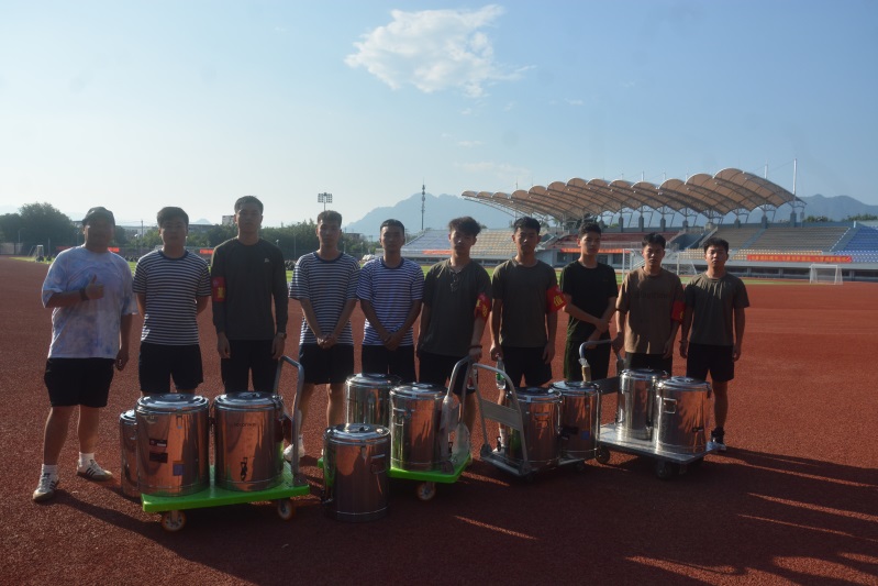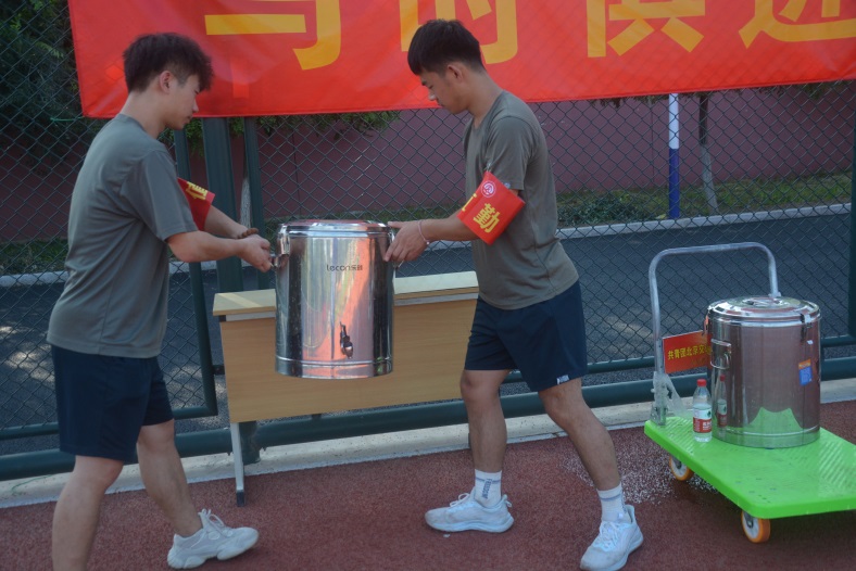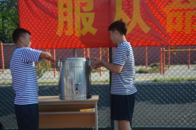 天氣炎熱,訓練辛苦,為使同學們在訓練場直接喝到健康的熱開水,我院學生處在訓練場設立了十處飲用水服務點,每天供應熱開水,為同學們和教官能夠及時補充水分滿足身體所需。每天早晨,在團委顏金海老師的組織下,退役軍人志愿者們就準時將十桶熱開水運送至訓練場擺放整齊有序,每下午訓練前,再將空桶取走補水接滿再送回訓練場。在學院團委顏金海老師和志愿者們共同努力下,每天在各點巡視,確保軍訓期間熱水滿桶,平均每天供水量10余桶。