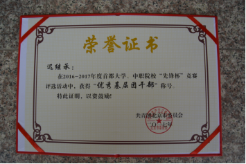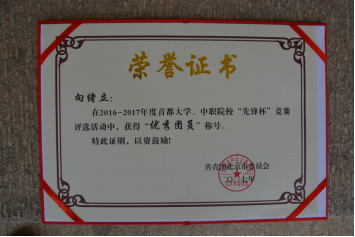 在此次評比中,我院向緒立、孫堂茗同學獲得“2016——2017年度首都大學、中職院校‘先鋒杯’優秀團員”榮譽稱號;張哲溪、遲繼承同學獲得“2016——2017年度首都大學、中職院校‘先鋒杯’優秀基層團干部”榮譽稱號。