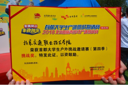 北京交通職業(yè)技術(shù)學(xué)院作為北京市高職院校代表,由團(tuán)委顏金海老師、院學(xué)生會外聯(lián)部孫培峰同學(xué)領(lǐng)隊(duì),由李子丹、劉瑩、榮亞、趙嘉麒、田源組成的參賽隊(duì)榮獲北京市挑戰(zhàn)獎。