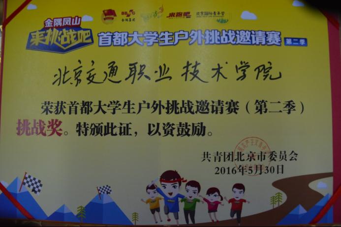北京交通職業(yè)技術(shù)學(xué)院作為北京市高職院校代表,由團(tuán)委顏金海老師、院學(xué)生會于文東同學(xué)領(lǐng)隊,院團(tuán)委學(xué)生會干部代表參加了此次比賽。由陳佳煒、魏晨、于鵬輝、靳璐陽、祝子悅組成的參賽隊榮獲北京市挑戰(zhàn)獎。