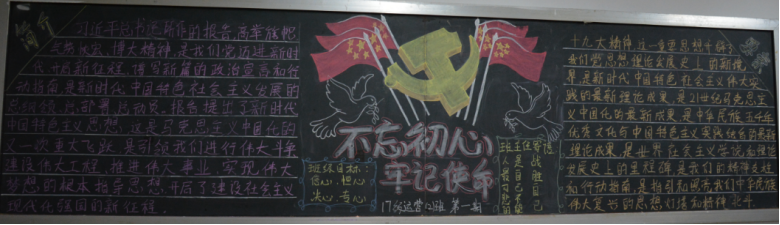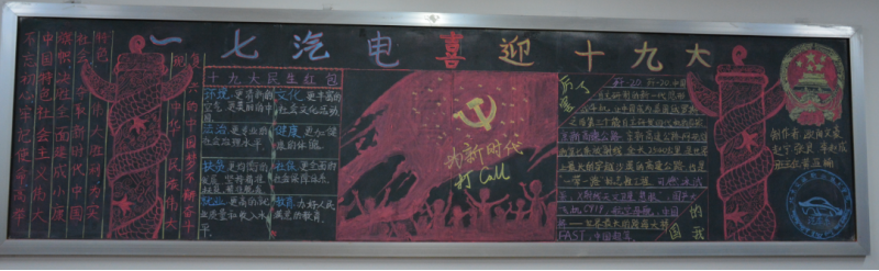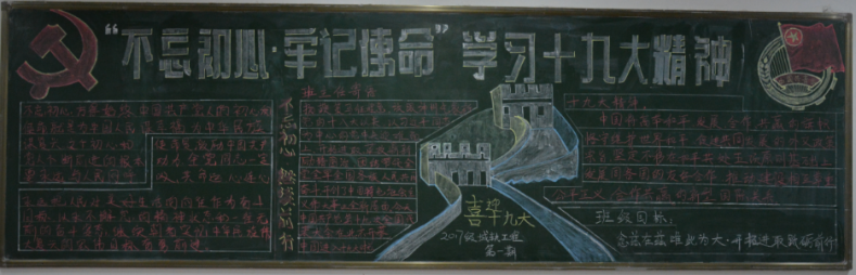 一張張設計風格各具特色的黑板報呈現在大家的眼前。本次活動是使用晚自習教室內的后黑板宣傳黨的十九大精神為主要內容,共有18個團支部積極行動,精心設計,用絢麗的粉筆精心制作了一張張圖文并茂的黑板報,緊密結合實際,從多方面、多角度幫助同學們深刻領會、全面把握黨的十九大精神,引導團支部宣傳愛黨、愛祖國,樹立永遠跟黨走的決心。進而勤奮學習,立志早日成為祖國合格的建設人才。