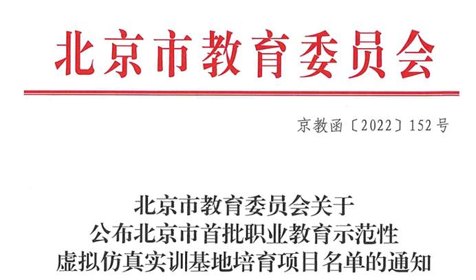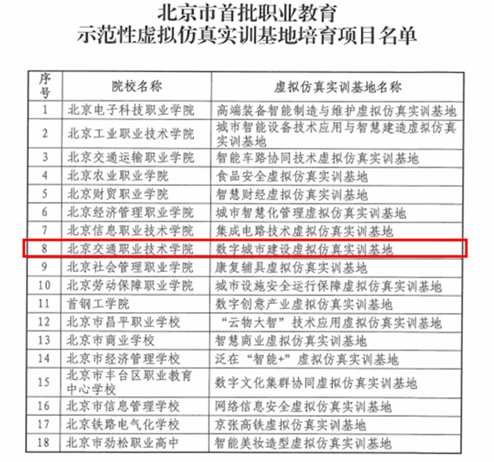2022年4月25日,北京市教育委員會公布了北京市首批職業教育示范性虛擬仿真實訓基地培育項目名單,北京交通職業技術學院“數字城市建設虛擬仿真實訓基地”名列其中。