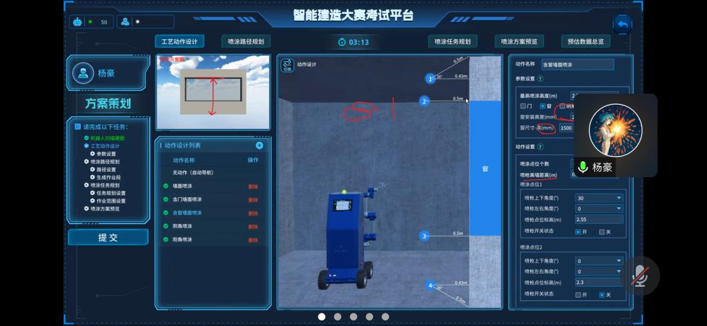 主要考察參賽選手建筑機器人基礎原理、本體結構、噴涂工藝、施工作業、安全標準及維護保養等知識,能夠應用建筑機器人施工策劃系統,完成建筑機器人“認知學習、施工準備、方案策劃、噴涂準備、路徑規劃、參數設定、作業模擬和施工結束”等考試內容。