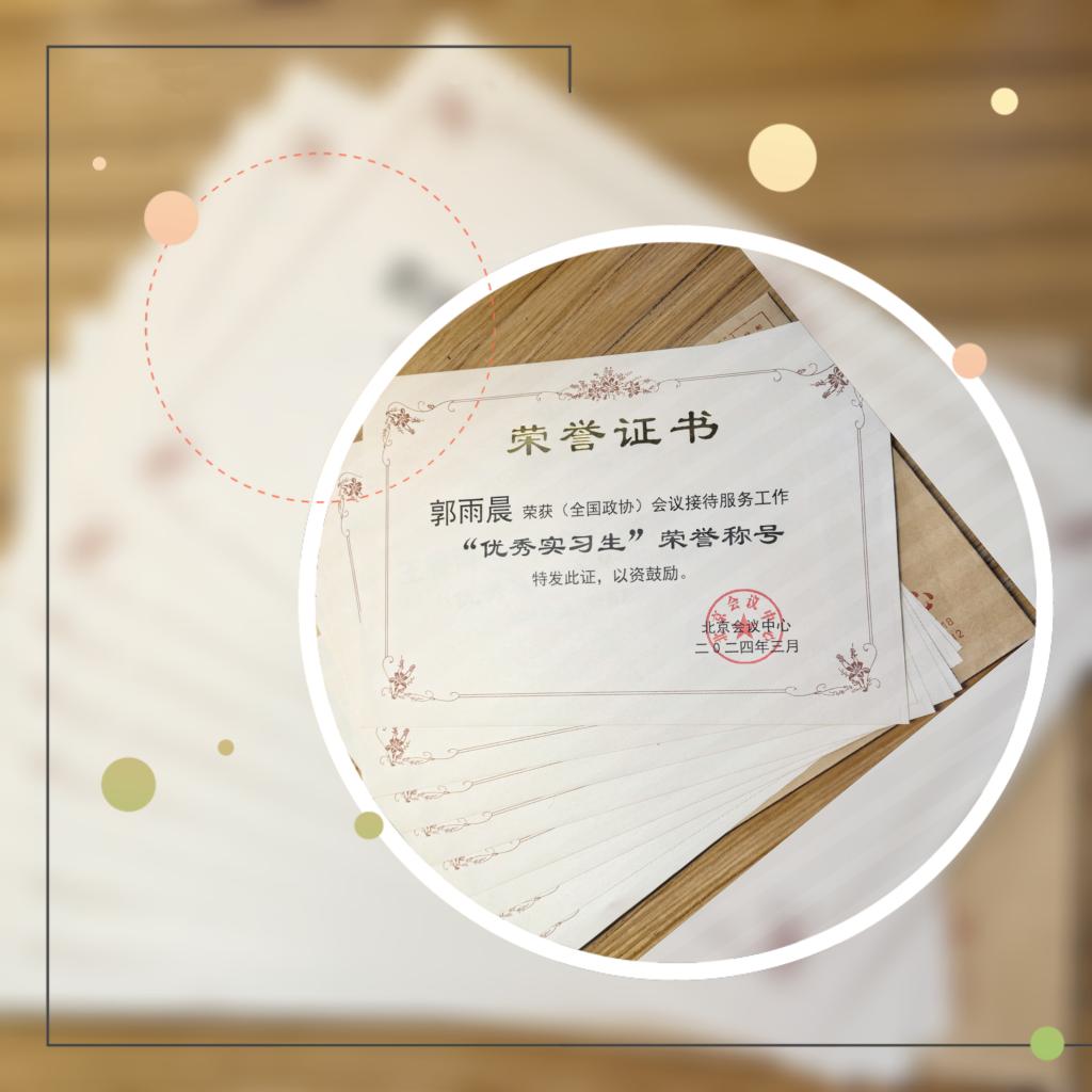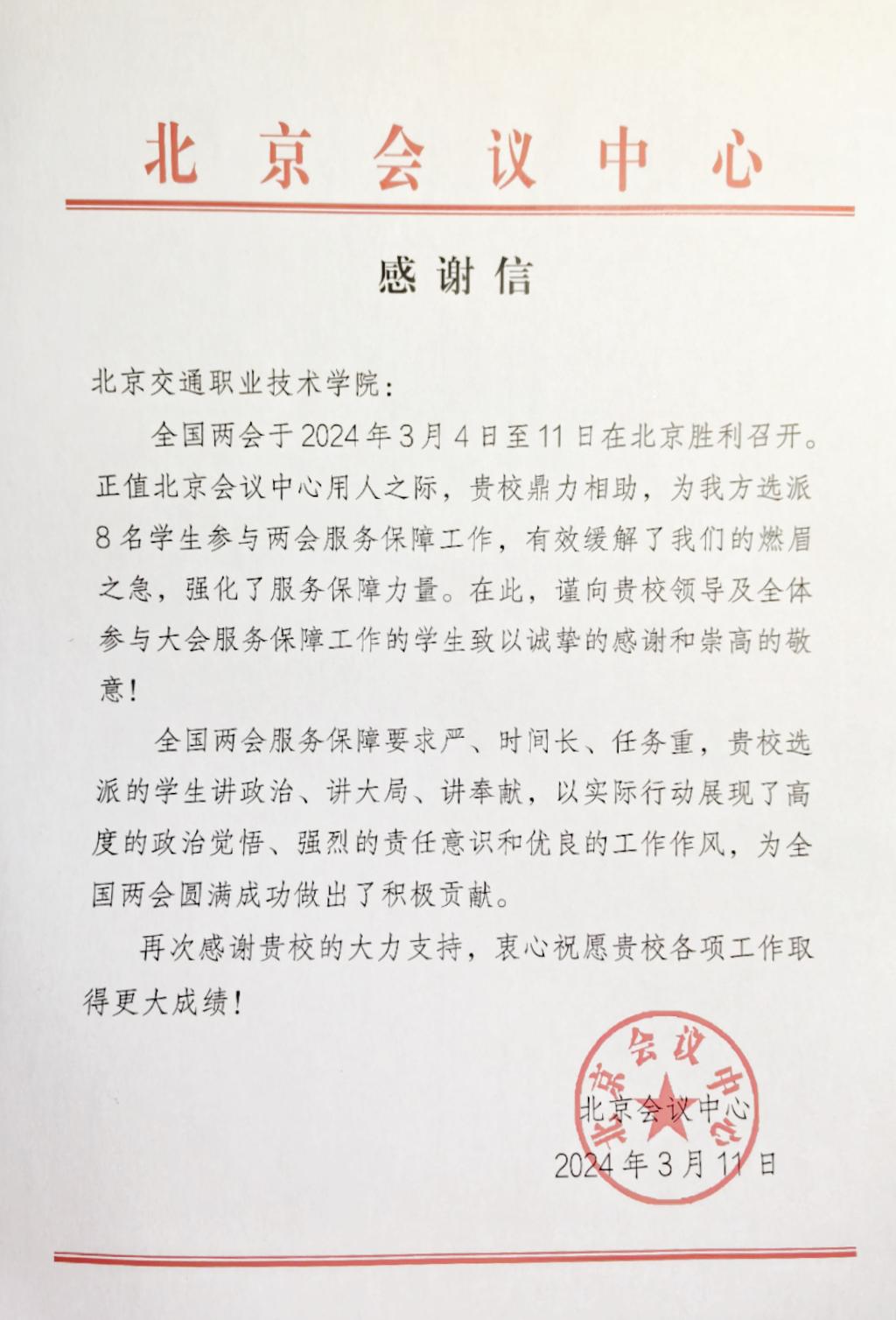 北京會(huì)議中心對(duì)學(xué)院參與兩會(huì)服務(wù)保障工作的8名學(xué)生致信感謝并頒發(fā)榮譽(yù)證書。參與志愿服務(wù)的同學(xué)表示,作為新時(shí)代的大學(xué)生,他們非常榮幸有機(jī)會(huì)能參與到國(guó)家級(jí)會(huì)議服務(wù)保障工作中。服務(wù)兩會(huì),不僅提升了他們的綜合素質(zhì)和應(yīng)變能力,更近距離地感受到祖國(guó)的日益強(qiáng)大,青年一代的責(zé)任重大。他們將總結(jié)好、運(yùn)用好服務(wù)兩會(huì)的經(jīng)驗(yàn),不斷在實(shí)踐中提升自己的業(yè)務(wù)能力。