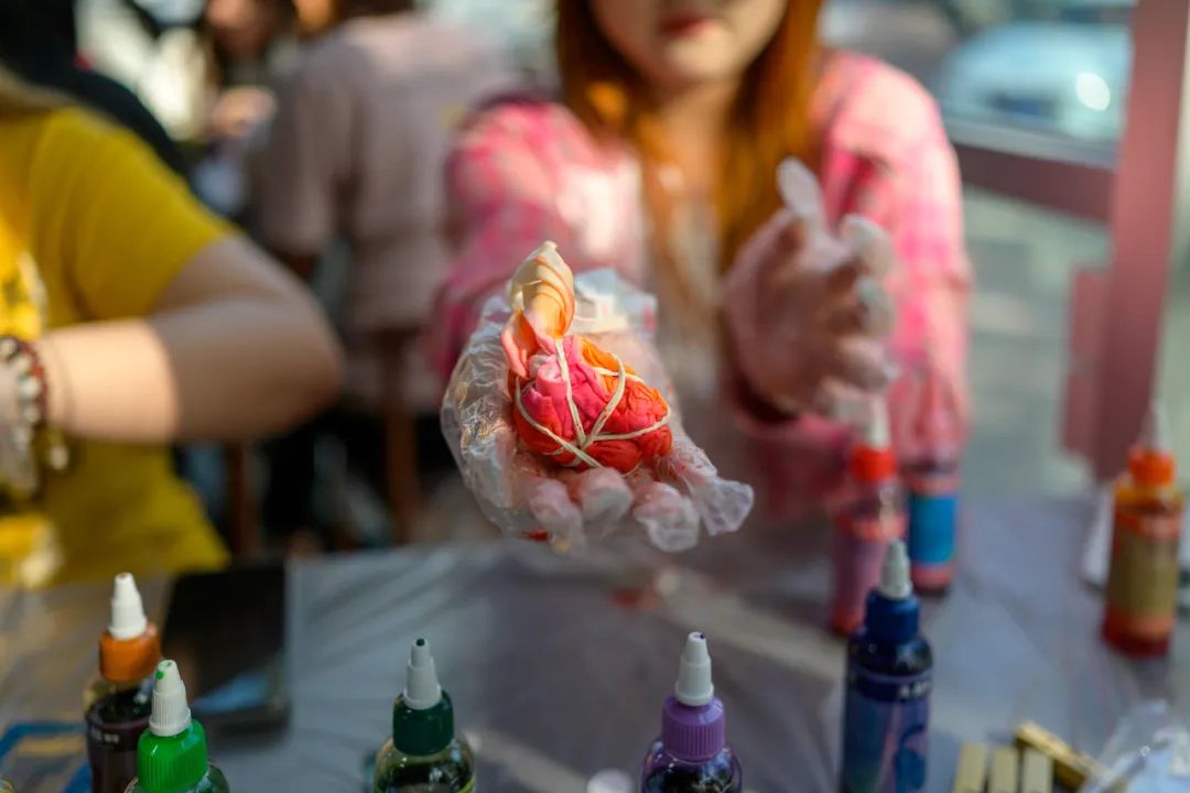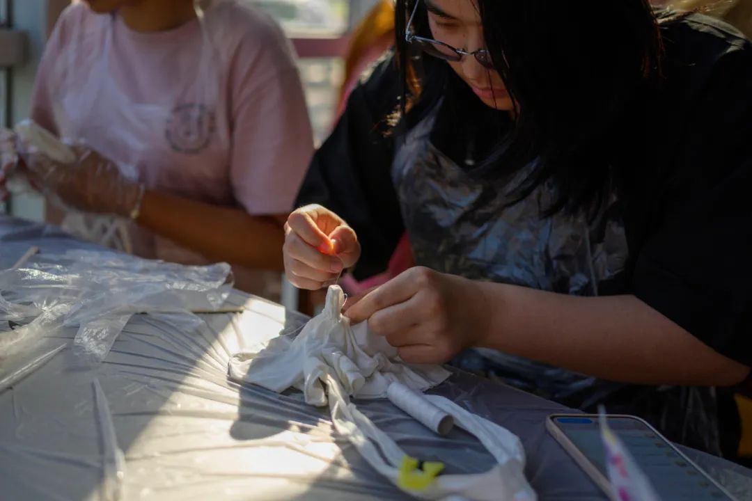 活動伊始,負責人詳細介紹了扎染的歷史淵源、工藝流程和藝術特色。扎染作為中國民間傳統而獨特的染色工藝,承載著古人的智慧與審美,其“扎結-染色-拆線”的過程充滿驚喜與期待。隨后,展示了扎染的基本技法,如“蝴蝶扎”“螺旋扎”等,巧妙的扎結方式在白布上創造出多樣的圖案肌理,為后續染色奠定基礎。