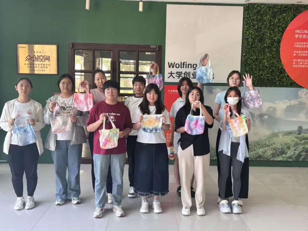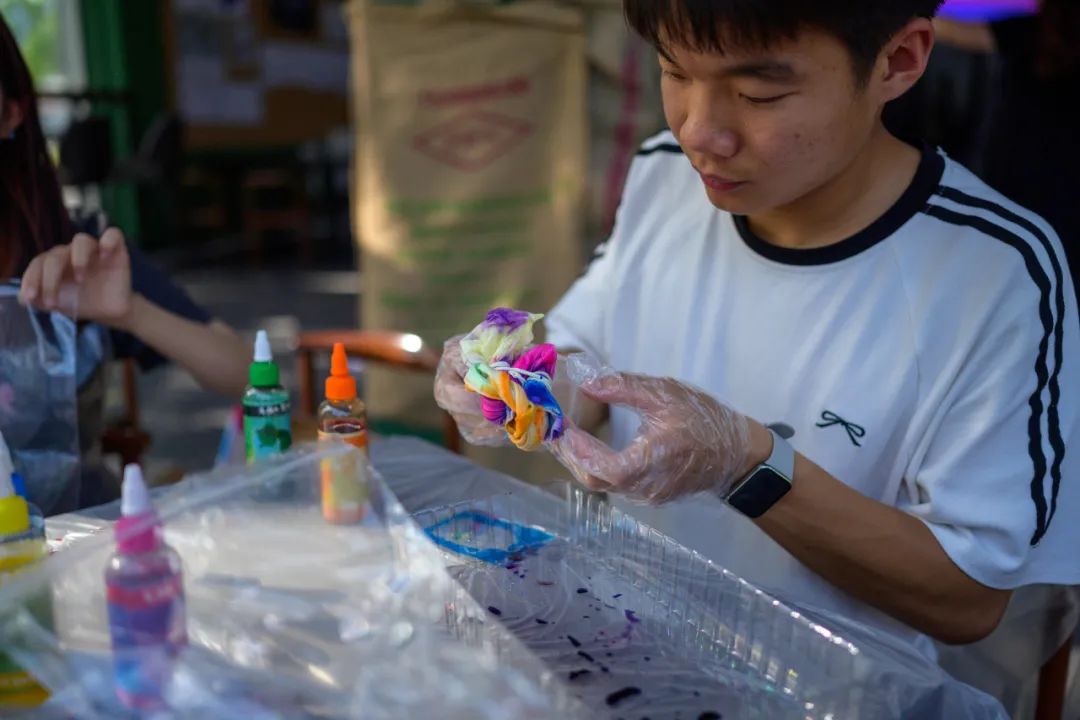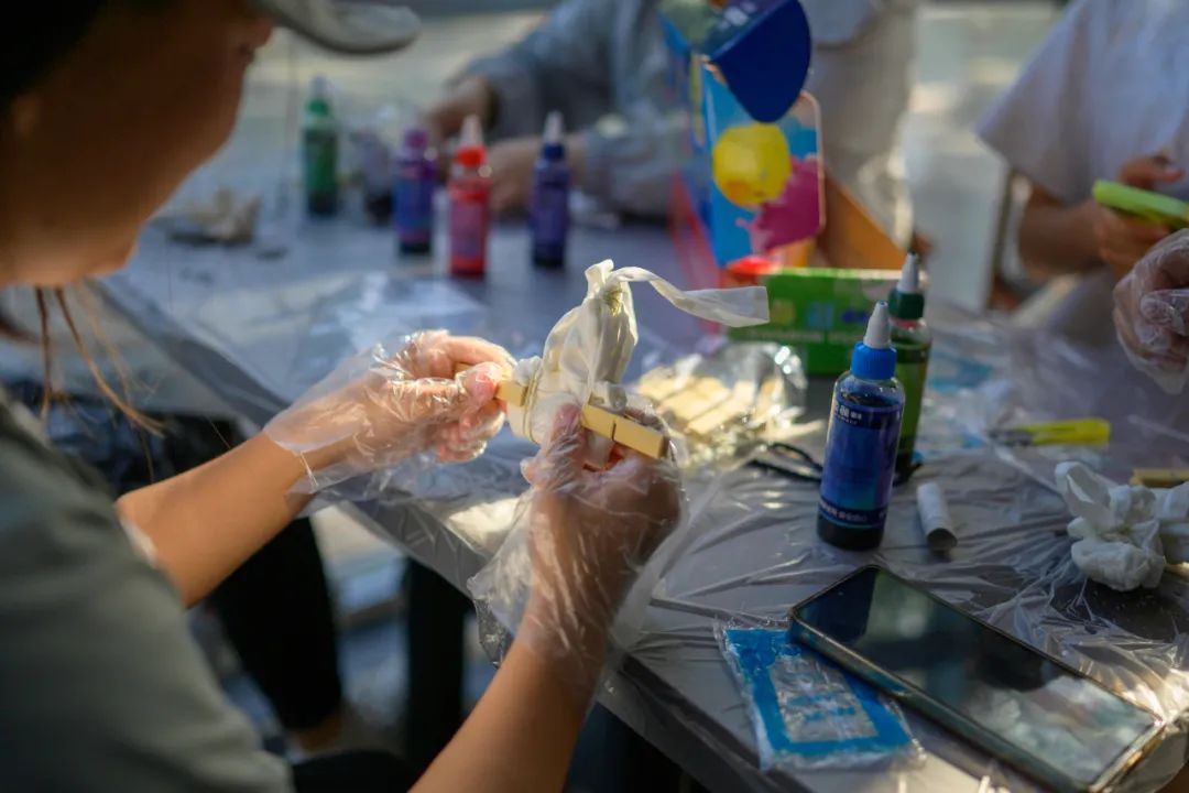 在實踐環節,同學們熱情高漲,充分發揮想象力和創造力。他們精心設計圖案,反復調整扎結松緊,將普通的白色布料變成充滿個性的藝術品。浸染環節中,同學們將扎好的布料放入染料池中,耐心等待色彩滲透。等待作品“開盲盒”的過程充滿期待。當拆開扎線,-幅幅獨一無二的扎染作品呈現在眼前,暈染的色彩、靈動的圖案讓大家驚嘆不已。大家紛紛拿起自己的扎染成果進行合影留念。師生們收獲的不僅是獨特的扎染作品,更是對中華文化基因的認同與傳承。