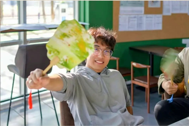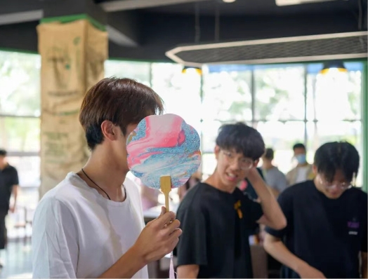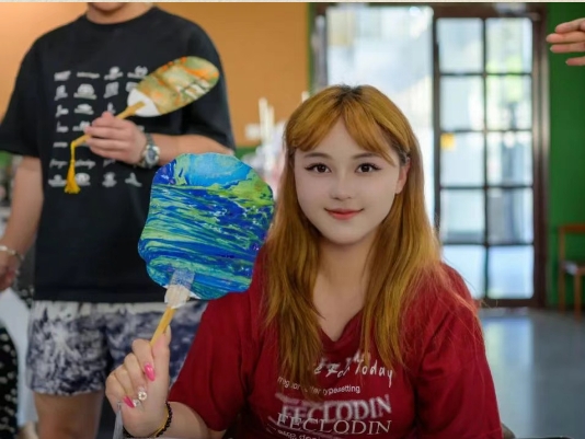 隨后,同學們開始動手制作屬于自己的漆扇。從勾勒圖案到調配顏料,從細致上色到修飾完善,每-個步驟都凝聚著同學們的專注與熱情。活動現場,同學們相互交流、分享創意,互幫互助。大家充分發揮想象力和創造力,將現代元素與傳統工藝相結合,創作出了--件件獨具特色的漆扇作品。經過近兩個小時的精心創作,-把把色彩斑潤、獨具匠心的漆扇呈現在大家眼前。大家紛紛拿起自己的漆扇合影留念。