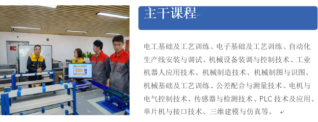 電工基礎及工藝訓練、電子基礎及工藝訓練、自動化生產線安裝與調試、機械設備裝調與控制技術、工業機器人應用技術、機械制造技術、機械制圖與識圖、機械基礎及工藝訓練、公差配合與測量技術、電機與電氣控制技術、傳感器與檢測技術、PLC技術及應用、單片機與接口技術、三維建模與仿真等。
