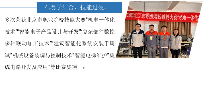 多次榮獲北京市職業院校技能大賽“機電一體化技術”“智能電子產品設計與開發”“復雜部件數控多軸聯動加工技術”“建筑智能化系統安裝于調試”“機械設備裝調與控制技術”“智能電梯維護”“集成電路開發及應用”等比賽獎項。