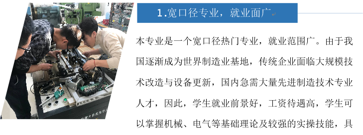 本專業是一個寬口徑熱門專業,就業范圍廣。由于我國逐漸成為世界制造業基地,傳統企業面臨大規模技術改造與設備更新,國內急需大量先進制造技術專業人才,因此,學生就業前景好,工資待遇高,學生可以掌握機械、電氣等基礎理論及較強的實操技能,具備一技之長。