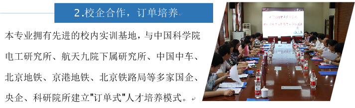 本專業擁有先進的校內實訓基地,與中國科學院電工研究所、航天九院下屬研究所、中國中車、北京地鐵、京港地鐵、北京鐵路局等多家國企、央企、科研院所建立"訂單式"人才培養模式。