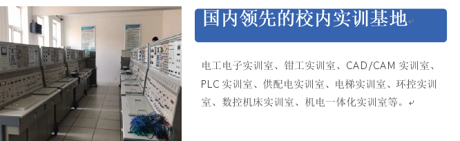 電工電子實訓室、鉗工實訓室、CAD/CAM實訓室、PLC實訓室、供配電實訓室、電梯實訓室、環控實訓室、數控機床實訓室、機電一體化實訓室等。