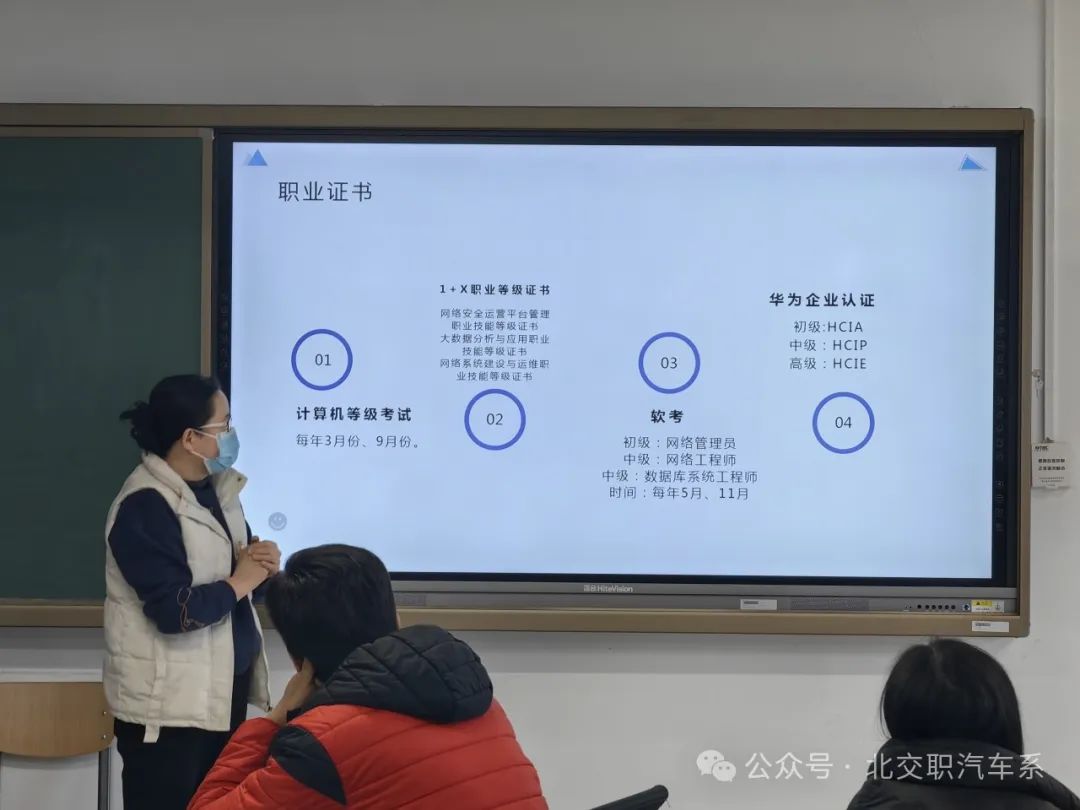 會上,王會霞老師首先為大家介紹了計算機專業(yè)的專業(yè)背景以及專業(yè)就業(yè)面向。隨后又帶大家了解了計算機專業(yè)與華為、博海迪、銳捷等相關企業(yè)合作的情況。還為大家展示了計算機專業(yè)的相關證書,并解釋了相關證書的考取流程以及對相關學生就業(yè)的影響。最后,為大家說明了由平臺基礎課程以及專業(yè)拓展課程和核心課程組成的計算機專業(yè)課程體系。