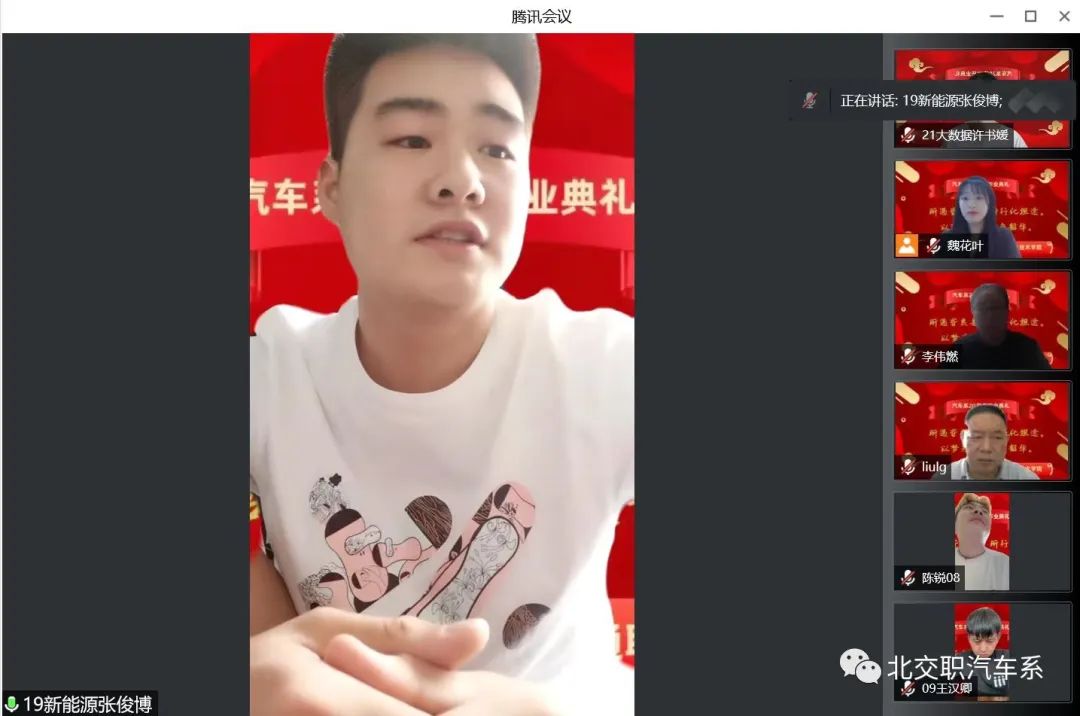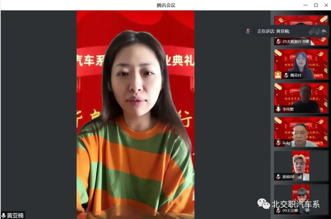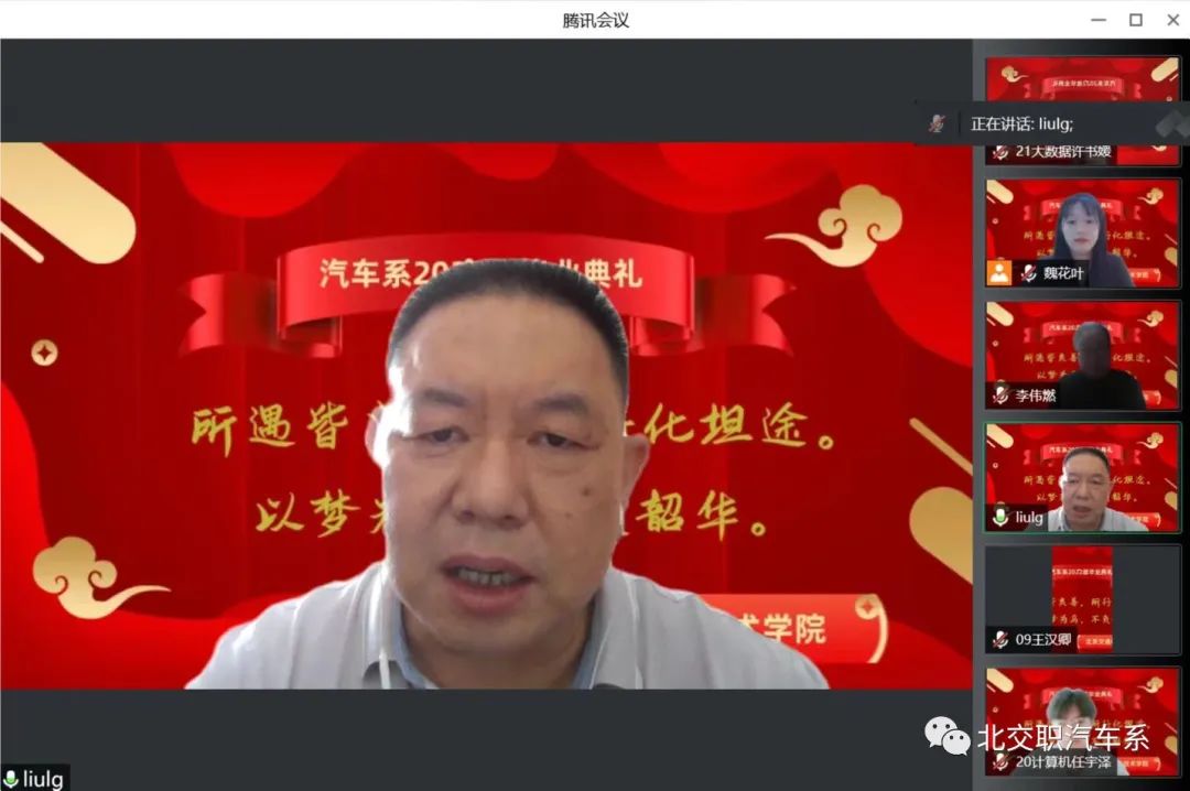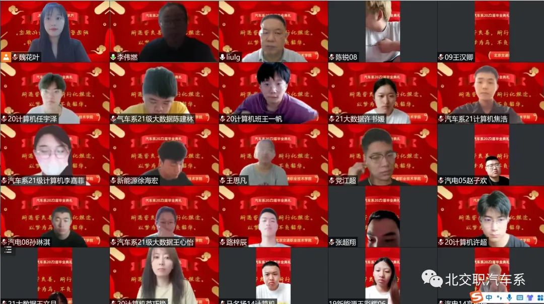 青春無悔,歲月為歌,又是一年盛夏好風景。畢業離別,情誼長存,得遇師友,深感榮幸。在這個因疫情而特殊的畢業季,7月2日上午十點,北京交通職業技術學院汽車系2022屆畢業生 “云”畢業典禮隆重舉行。此次參會人員有汽車系主任劉連光老師,汽車系黨支部書記李偉燃老師,汽車系班主任黃亞楠老師,汽車系計算機教研室主任姜丹老師,汽車系2019級畢業生及汽車系全體在校學生,共聚“云端”,參加了本次儀式。畢業典禮由我系黨支部書記李偉燃老師主持。