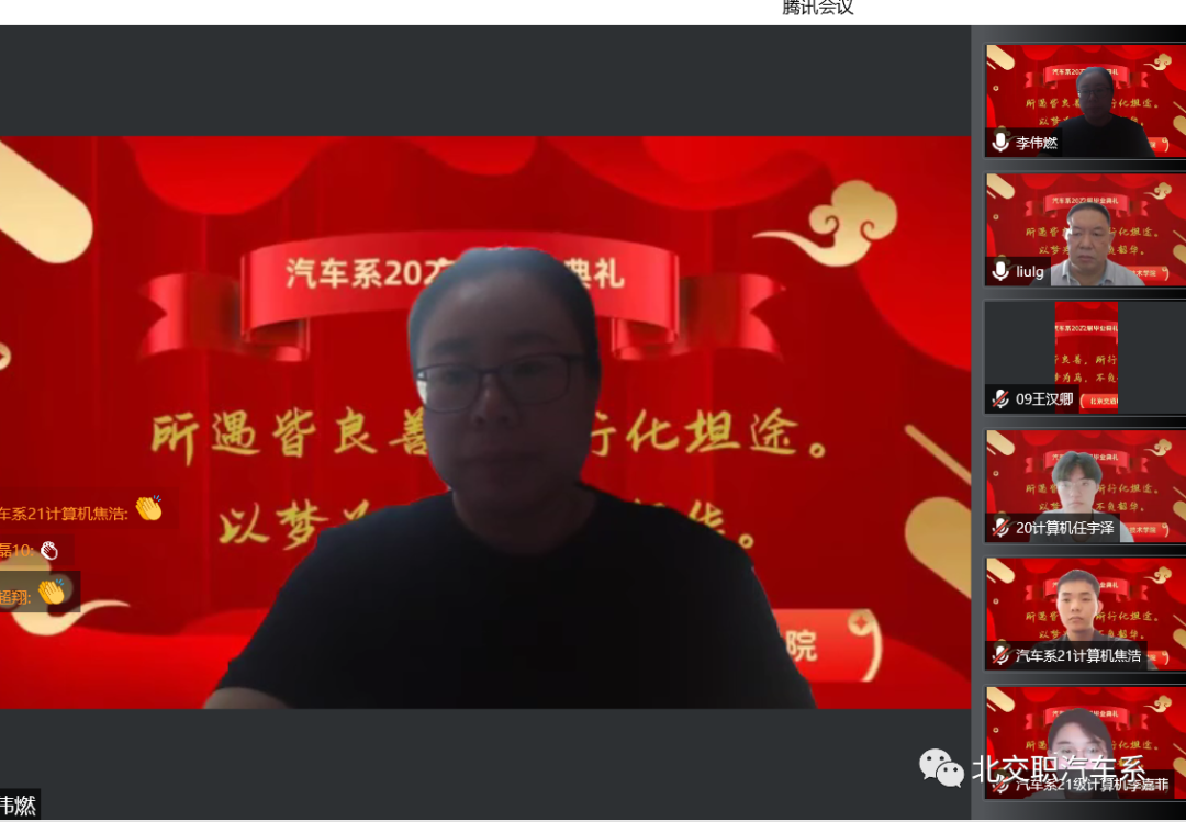 典禮在我系黨支部書記李偉燃老師的主持下拉開了序幕。畢業典禮正式開始后,汽車系全體師生開啟視頻,云端相聚,合影留念。以熱烈的掌聲歡迎全體參會教師,慶祝本屆畢業生圓滿完成學業。