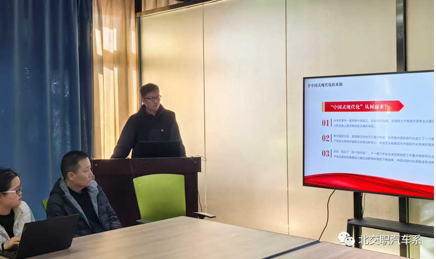 為推動學習貫徹習近平新時代中國特色社會主義思想主題教育走深走實,筑牢思想根基、強化理論武裝,11月9日下午1點30分于教一樓402,汽車系黨支部徐國棟書記以“中國式現代化”為主題,面向汽車系全體黨員,講授了一堂主題鮮明、內容豐富的專題黨課。
