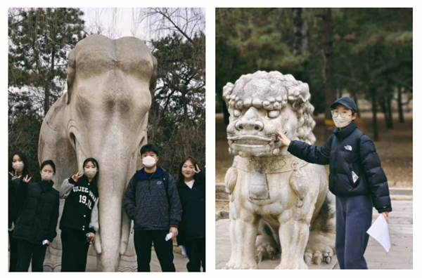 明十三陵景區(qū)被列入世界文化遺產(chǎn)名錄和全國重點文物保護單位,享譽中外,歷史文化淵源深厚。本次實踐的首站是景區(qū)內(nèi)的神路。神路原是長陵神道,是長陵陵寢建筑的前導(dǎo)部分,總長約7.3公里。李志宇和梁紅茹兩位同學(xué)分別對其概況特色以及石像生進行了模擬講解。一路行來,他們展示出來很多基本的團隊游客帶領(lǐng)的技巧和策略,在娓娓道來的文化內(nèi)涵講解和回答游客問題的互動中,鍛煉了基本帶團素養(yǎng)。