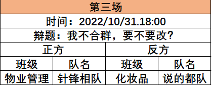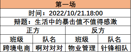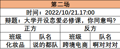 本次比賽公平、公正、公開,參賽人員分別為22級(jí)化妝品經(jīng)營與管理、22級(jí)現(xiàn)代物業(yè)管理與22級(jí)跨境電子商務(wù)三個(gè)專業(yè),每隊(duì)分為正、反兩方分別有四個(gè)辯手,對(duì)戰(zhàn)情況如下: