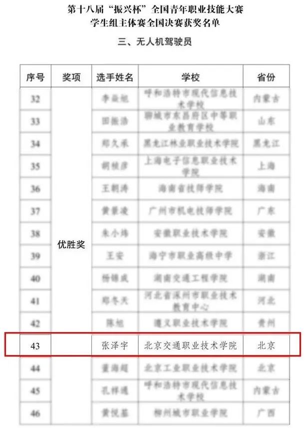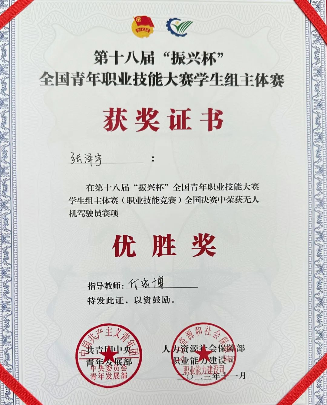 本次大賽以“踔厲奮發啟新程 挺膺擔當建新功”為主題,主體賽于11月25日至28日在杭州舉辦,聚焦新職業、新領域,設置智能硬件裝調員、工業視覺系統運維員S、無人機駕駛員、儀器儀表維修工、機床裝調維修工5個競賽職業(工種),大賽吸引超過12萬名學生參加,經過層層選拔,最終436名選手同臺競技,經過激烈角逐,我院無人機應用專業學生張澤宇在無人機駕駛員賽項榮獲優勝獎,在北京代表隊中排名第二。