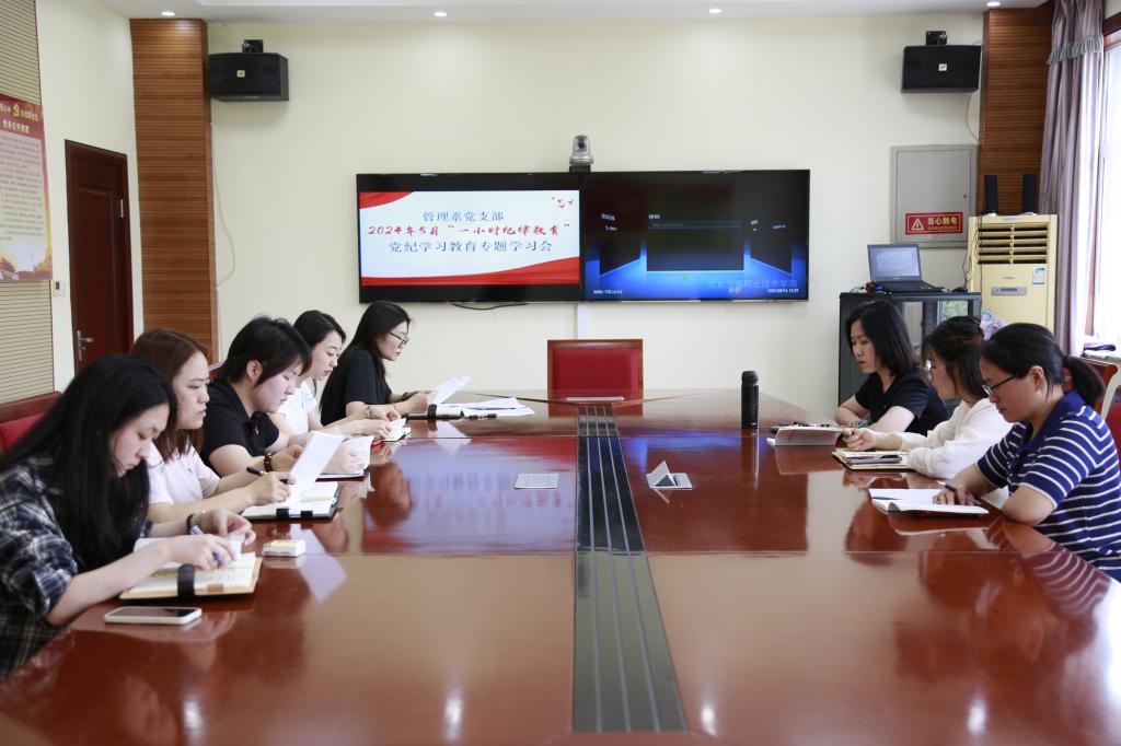 6月6日下午,管理系黨支部在辦公樓二層會議室召開2024年6月“一小時紀律教育”專題學習會議,黨支部書記滕輝主持會議。首先,管理系黨支部全體黨員集體學習了市紀委市監(jiān)委下發(fā)的《2024年系列警示教育片》。片中深...